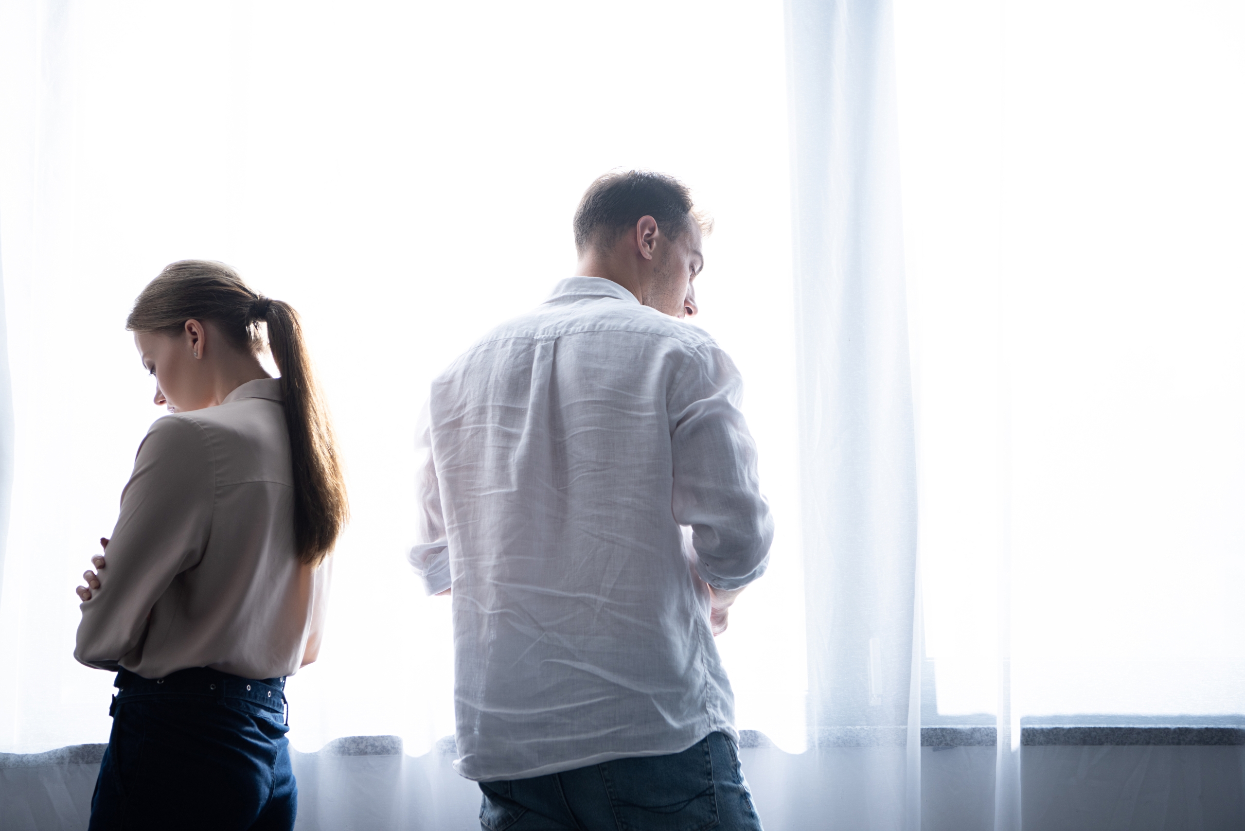 - upset woman and man in shirts standing near window